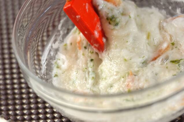 長芋は皮をむき、すりおろす。ボウルに<タネ>の材料を入れ、長芋を加えてよく混ぜる。