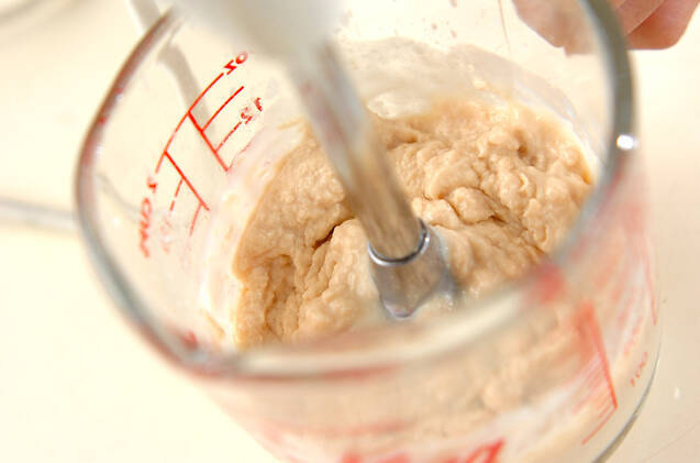 <酒粕鍋>を作る。耐熱ボウルに酒粕を小さくちぎって入れ、かぶる位まで鶏鍋のスープを加えてラップをかけ、電子レンジで3~4分加熱する。酒粕が柔らかくなったらハンドミキサー等でペースト状になるまでかくはんする。他の<酒粕鍋/合わせ調味料>の材料も加え、さらにかくはんする。