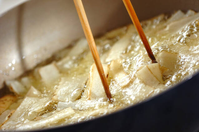 (1)のゴボウの水気をきれいなタオルでしっかり拭き取り、(2)の揚げ油に入れ、時々菜ばしで混ぜながら、サクッと揚げる。揚げ油をしっかりきり、器に盛って塩をかける。