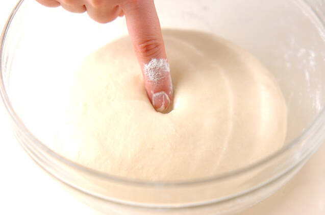 生地が2倍程度になったら、指先に強力粉(分量外)をつけて生地に差し込む。穴が縮まなかったら一次発酵を終了しても良い。