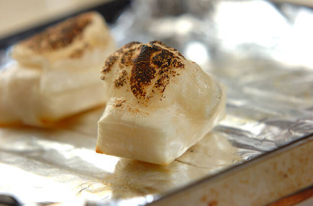 角餅はトースターで少し焼き色がつくまで焼き、器に入れて(2)を注ぎ入れる。