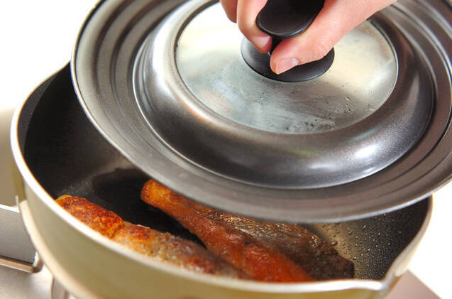 表面に美味しそうな焼き色がついたら、サーモンを返し、同様に焼き色がついたら白ワインを加える。煮たったらフライパンに蓋をして火を少し弱め、3~4分蒸し焼きにし、器に盛る。