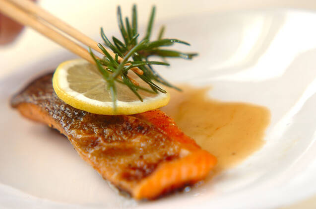 (2)のフライパンを中火で熱し、レモン汁、バターを加えて手早く混ぜ合わせる。サーモンにかけ、レモン、タイム、ローズマリーを飾る。
