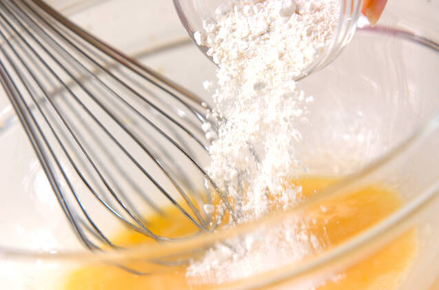 砂糖、ハチミツを加えてよく混ぜ合わせ、白玉粉を入れて混ぜ合わせる。更に薄力粉、ベーキングパウダー、塩を加え、粉っぽさがなくなるまで混ぜ合わせる。