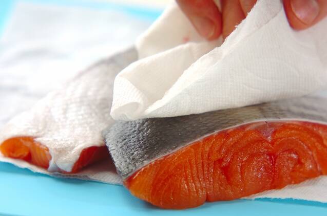 鮭は塩を振り、10分置いて水気を拭き取る。