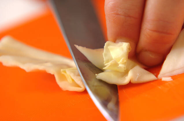 春キャベツは、幅1cmの短冊切りにして水洗いする。かたい芯の部分は削ぎ切りにする。