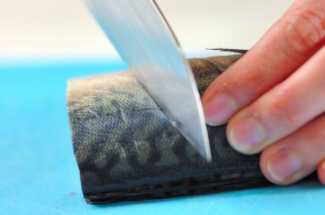 サバは身の厚い部分に切り込みを入れ、両面に塩を振る。玉ネギは縦薄切りにする。