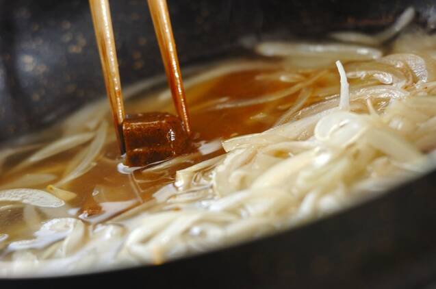 フライパンに分量外のサラダ油をひき、玉ネギを中火で炒める。しんなりとしたら、分量外の水200mlを加える。沸いたら一度火を止め、カレールウを溶かす。