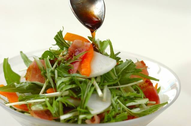 水菜、カブ、パプリカを混ぜ合わせ、器に盛る。上にベーコンを散らして(1)をかける。