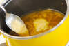 鍋にニンニク、ショウガ、サラダ油を入れて弱火で加熱する。キャベツと玉ネギを加えて、しんなりするまで中火で加熱する。