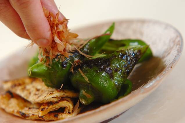万願寺唐辛子を食べやすい大きさに切り、(2)の油揚げと共に器に盛る。かつお節をかけ、刻みネギ、ショウガ、しょうゆを添える。