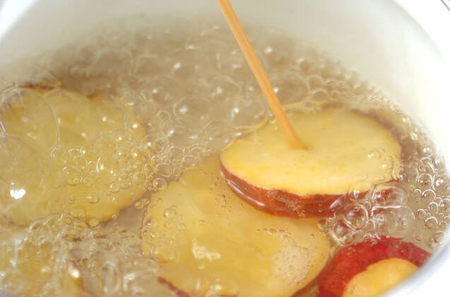 沸騰してきたら砂糖、塩を加え、竹串がスッと刺さるくらいまで煮る。