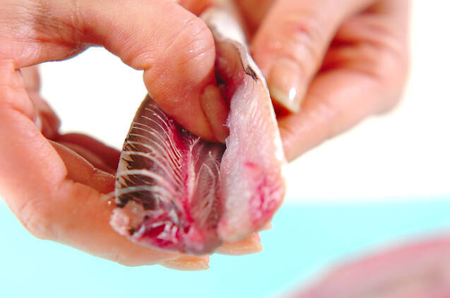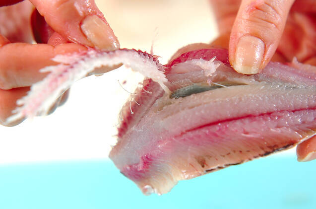 <イワシの手開き>頭を落とし、腹を斜めに切る。ワタを出して分量外の塩水で洗う。親指の腹を中骨に添わせて頭側から尾に向かって滑らせるように身をはがし、尾の付け根で骨を折り、身を押さえながら骨を頭に向かってはがすように取る。腹側に小骨がある場合は削ぎ落とし、尾と背ビレも切り落とす。※イワシの骨は水洗いし、キッチンペーパー等でしっかり水分を拭き取り、油でカリカリ揚げるとおいしいですよ!