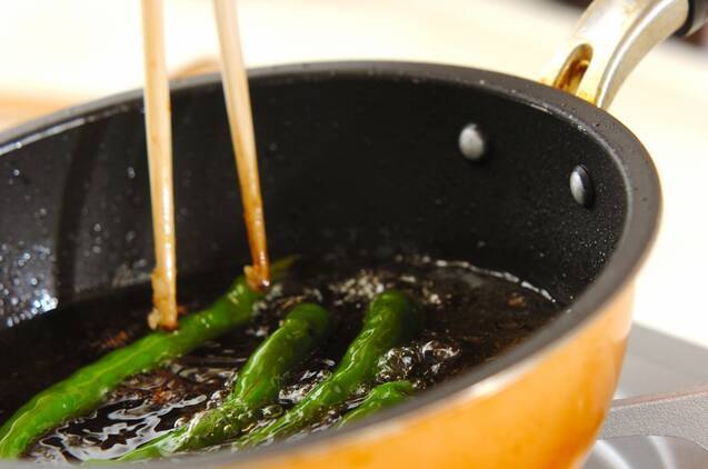 続けて長唐辛子を加え、鮮やかな緑色になったら油から上げ、分量外の塩を振る。