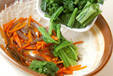 2に1、菊菜、ほうれん草を加えてサッと和える。器に盛り、刻みユズ皮をのせる。