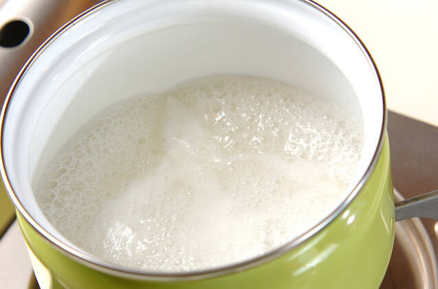 鍋に水、粉寒天を入れよく混ぜて梅酒の半量を加え、中火にかける。煮立ったら火を弱めて煮立った状態を保ちながら1~2分煮る。