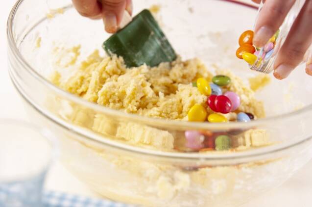 生地がまとまってきたらマーブルチョコを入れてザックリ混ぜ合わせる。