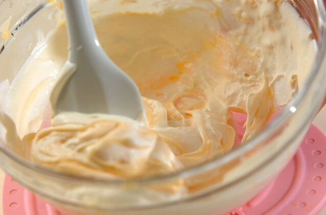 (7)にコアントローを加えてハンドミキサーでほぐす。角が立つまで泡立てた生クリームを混ぜ合わせて、絞り袋に入れる。