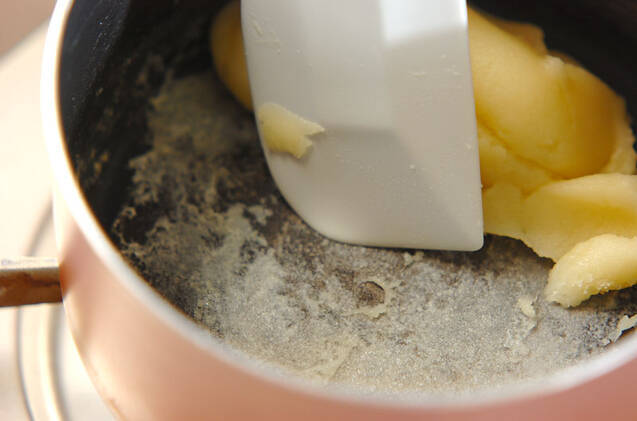 ひとまとまりになるまで混ぜて中火にかけ、鍋底に白い膜が張るまでよく混ぜながら加熱する。