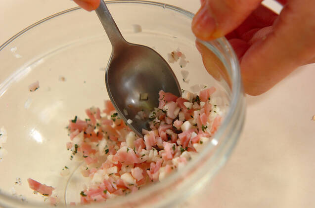 ベーコン、ニンニクをみじん切りにし、ドライパセリ、アンチョビペーストと混ぜ合わせる。