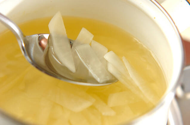 鍋にだし汁と大根を入れて中火にかけ、煮たったら大根が少し透明になるまで煮て、シイタケ、白ネギを加える。