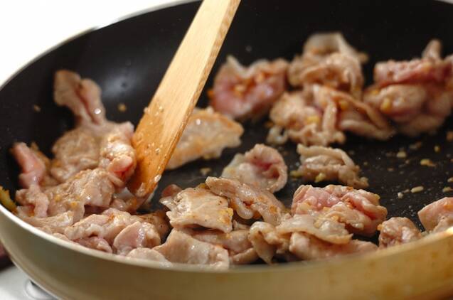 フライパンにゴマ油、ショウガ、ニンニクを入れて中火で熱し、香りがたったら豚肉を加え、色が変わるまで炒める。