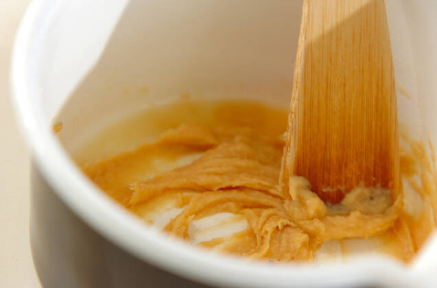 <木の芽田楽みそ>を作る。小鍋に白みそ、酒、みりん、砂糖を入れ、なめらかになるまでよく混ぜ合わせる。木ベラで混ぜながら、弱めの中火にかける。