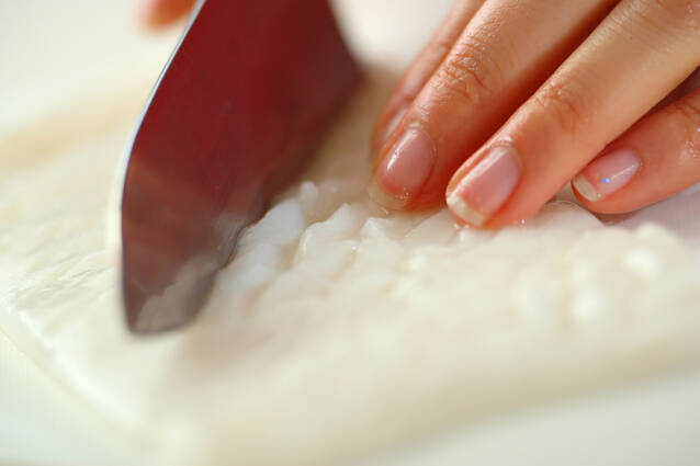 冷凍イカは解凍して水気を拭き取り、表面に格子に切り込みを入れ、ひとくち大に切る。
