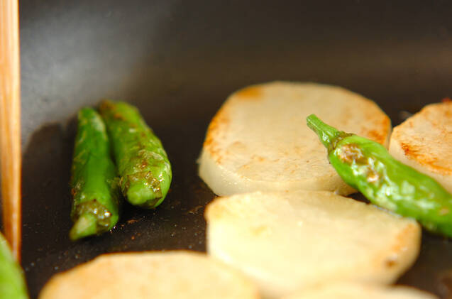 フライパンにゴマ油を熱し、長芋を両面焼き色がつくまで焼き、シシトウも転がしながら色よく焼く。