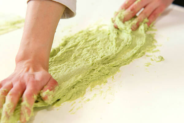 バターを細かくちぎって生地の上に置き、擦り込むようにこねる。(最初は手の平を使ってこねると、油分が生地に入っていきやすくなります)生地が台から離れまとまってきたら、台にたたきつけて切らないように生地全体を伸ばし、丸め、、を続けながらこねる。今回は少し柔らかめの生地です。