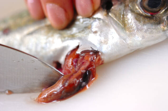 小アジは尾の付け根にあるゼイゴを削ぎ落とし、盛り付けた時に裏になる側の腹部分に切り込みを入れてワタを出し、エラブタを開けて内側のヒダ部分を取り出し、塩水できれいに洗い、水気を拭き取る。