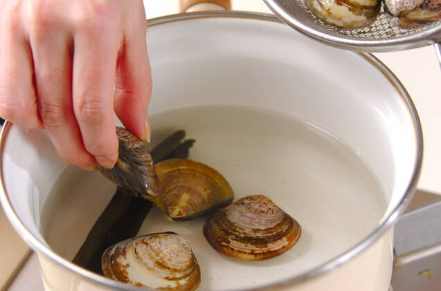 鍋に<だし>、ハマグリを入れて強火にかけ、煮立つ直前に昆布を取り出す。