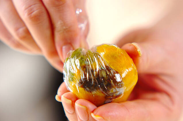 固く絞ったぬれ布巾かラップに<ラムレーズン>を混ぜたカボチャと抹茶を混ぜたカボチャを重ねてのせ、茶巾に絞って器にのせる。