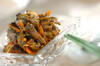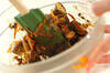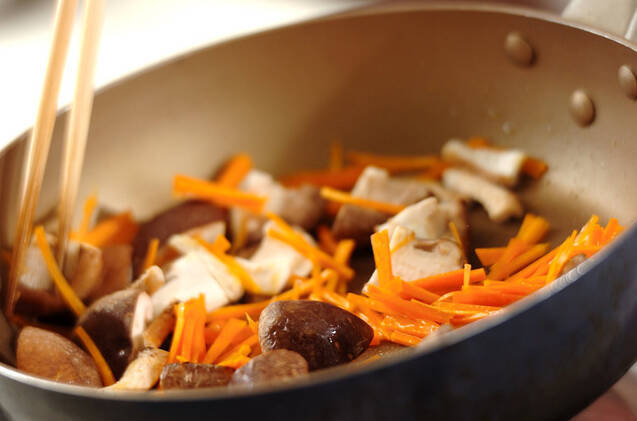 鍋にサラダ油を中火で熱し、ニンジン、シイタケを炒める。