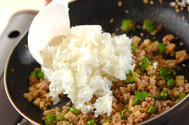 <調味料>を加えてサッと炒め、さらにご飯を加えて炒め合わせ、器に盛る。