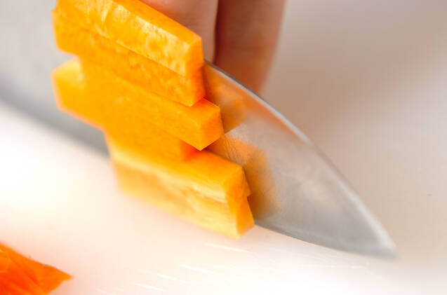 ニンジンは皮をむき、ゴボウに合わせて棒状に切る。
