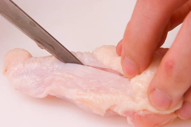 手羽元は身の厚い骨の際に添って切り込みを入れ、火の通りを良くする。