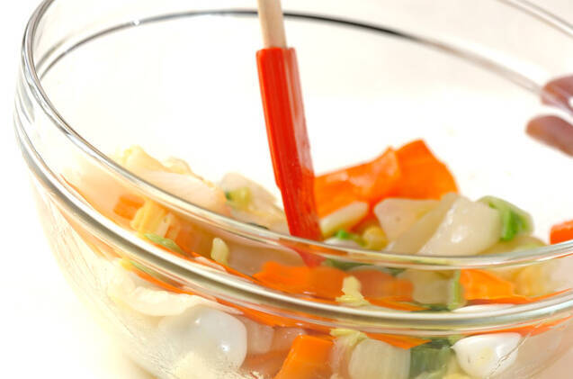 <合わせマリネ液>に(1)とゆでウズラ卵を加えて混ぜ合わせ、器に盛り分ける。