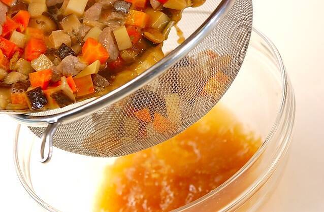 <調味料>を加え、弱めの中火で3~4分煮て味を含め、煮汁が残るくらいでいったん具と煮汁に分ける。