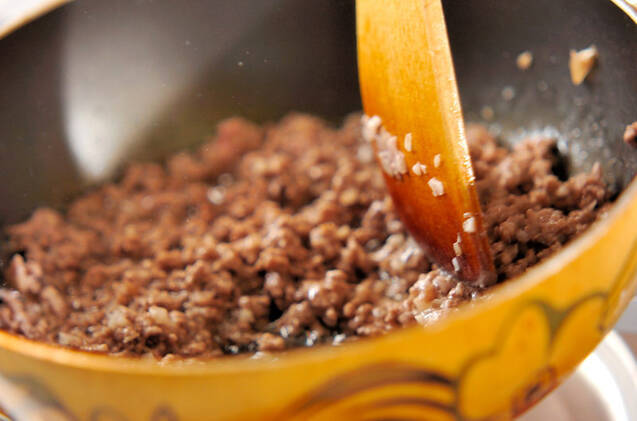 フライパンにサラダ油、ニンニク、ショウガを入れて中火にかけ、香りがたってきたら合いびき肉を加え、肉の色が変わるまで炒める。