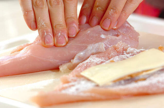 鶏むね肉の切り込みを広げて<衣>の小麦粉を薄く振り、半分に切ったスライスチーズをのせ、<練りみそ>をぬる。もう半分のスライスチーズをのせ、元の形に整える。(ヒント)つま楊枝で留めてもOK。