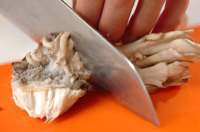 マイタケは石づきを切り落とし、小房に分け、ベーコンは幅1cmに切る。