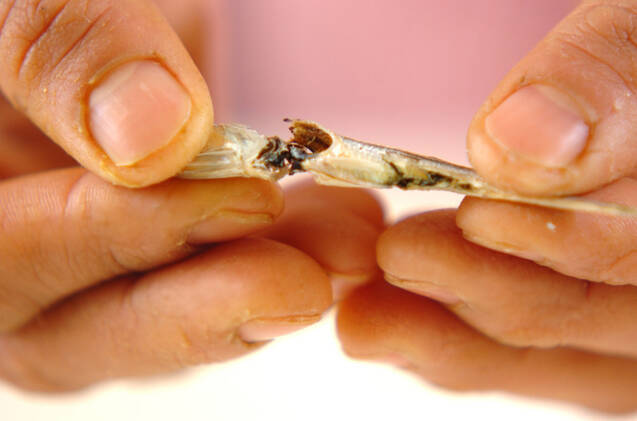 煮干しが少し大きめの場合は、頭を取って身を半分に裂き、ワタを取る。小さめの場合は、そのままでOKです。