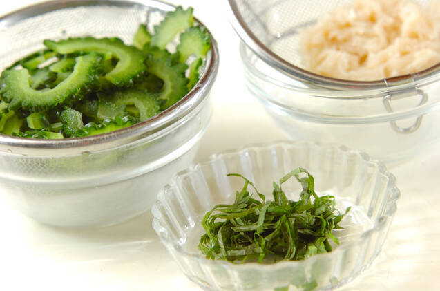 ゴーヤはスプーン等で種とワタを取り出して薄切りにし、熱湯に入れて煮たったら2~3分ゆでてザルに上げ、粗熱が取れたらしっかり水気を絞る。