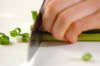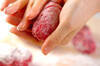まな板に牛肉を広げ、茶こし等で小麦粉大さじ1~2を薄く振り、<下味>でまとめた青ネギをのせ、クルクルと巻く(4~5本作る)。