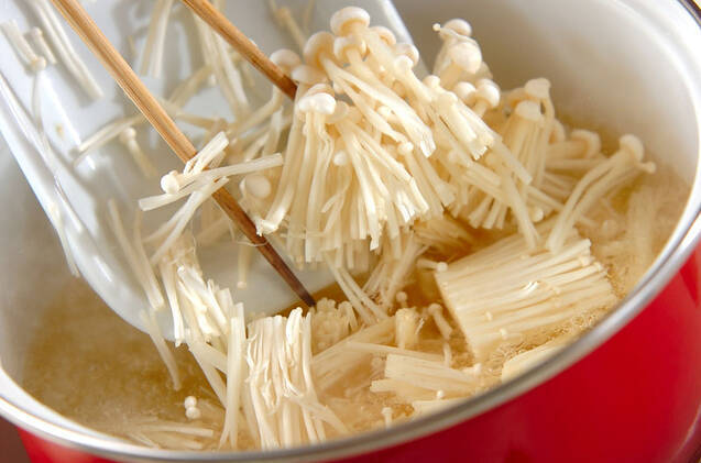 鍋にだし汁を入れて強火にかけ、煮立ったらエノキを加え再び煮立ったら白みそを溶き入れる。