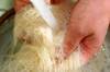 鍋に2000mlくらいの湯を沸かし、素麺を袋の指定時間ゆで、菜ばしで素麺をすくう。冷水でもみ洗いしてぬめりを取り、水気をきって器に盛る。