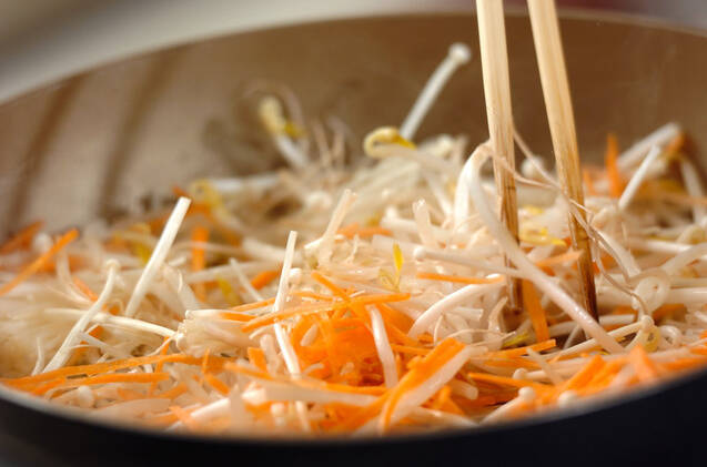 卵焼き器、またはフライパンにゴマ油少々を強火で熱し、モヤシ、エノキ、ニンジンをサッと炒め、塩コショウをしてザルに上げ、汁気をきって冷ます。