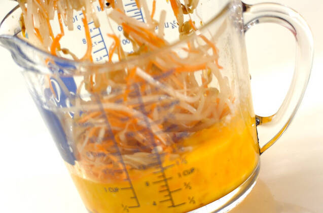 <卵液>を作る。卵は溶きほぐし、他の<卵液>の材料を混ぜ合わせ、冷ました(1)と刻みネギを加えて混ぜ合わせる。