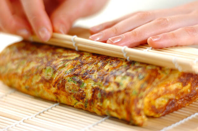 周りが固まって半熟になったら向こうから手前に巻き、同じ様にもう1度繰り返し、巻きすに巻いて形を整える。粗熱が取れたら、食べやすい大きさに切り、器に盛って甘酢ショウガを添える。